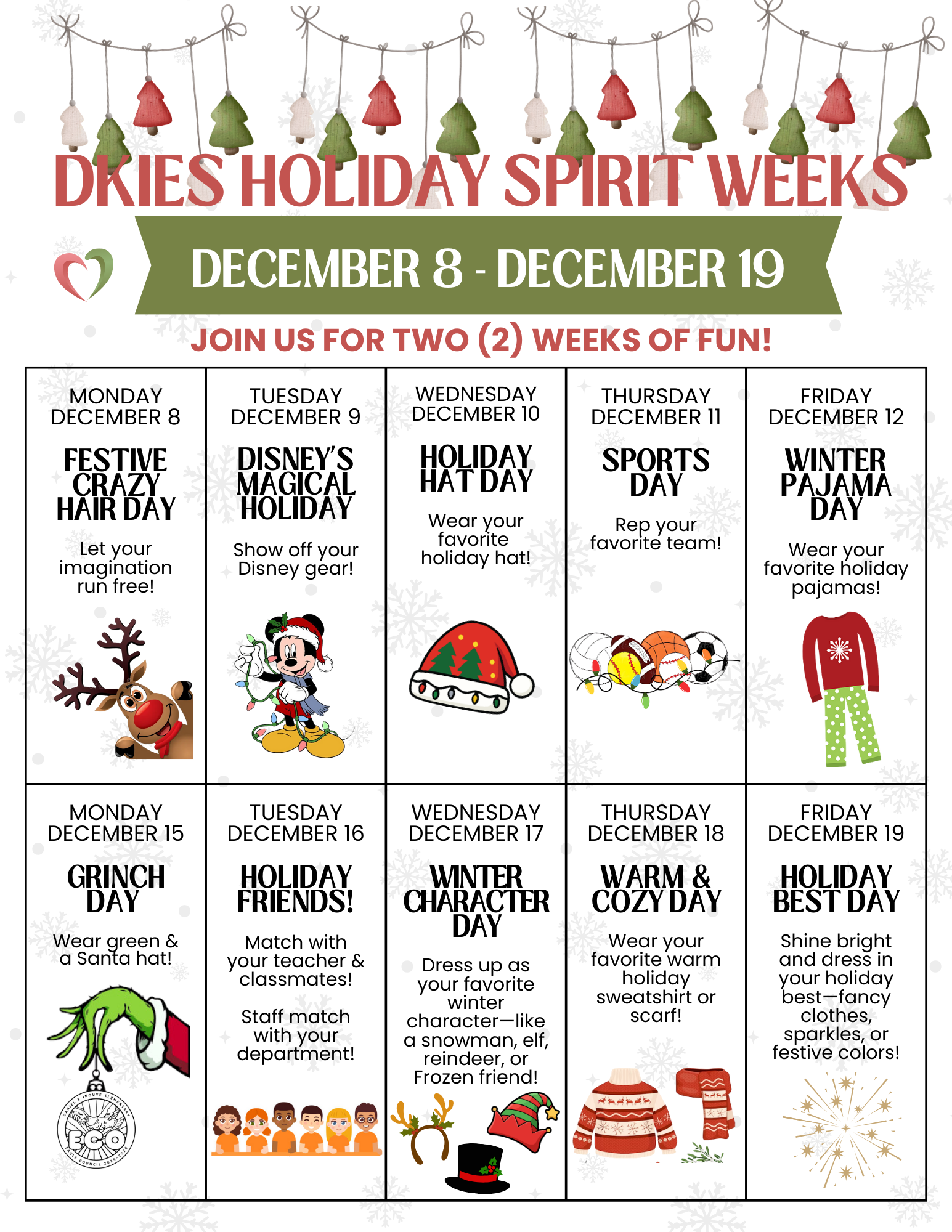 DKIES Holiday Spirit Weeks - December 8 - 19, 2025 Here's a special message from your ECO Team: Here’s What We’ve Planned for Two Weeks of Fun!